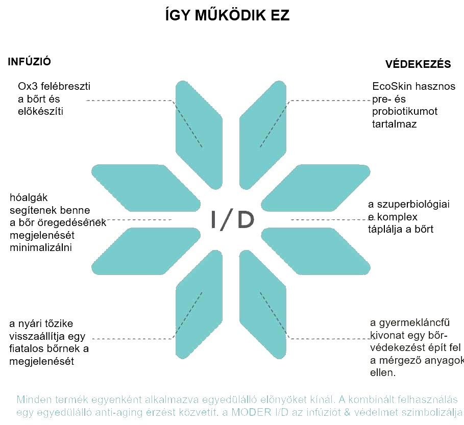 MODERE I/D EGY RENDSZER, AMELYRE EGY SZABADALMI* KÉRELMET NYÚJTOTTAK BE és arcbőrét természetes anyagokkal frissíti, azért hogy fiatalosabb megjelenést kölcsönözzön: egy fényes, világos bőr, egy friss, bársonyos szerkezet és egy azonnali csökkenése a szarkalábaknak és a ráncoknak. És nem csak ez, mert I/D hosszan védi bőrét a kezelések alatt is antioxidánsokkal, pro biotikumokkal és forradalmi természetes kivonatokkal.